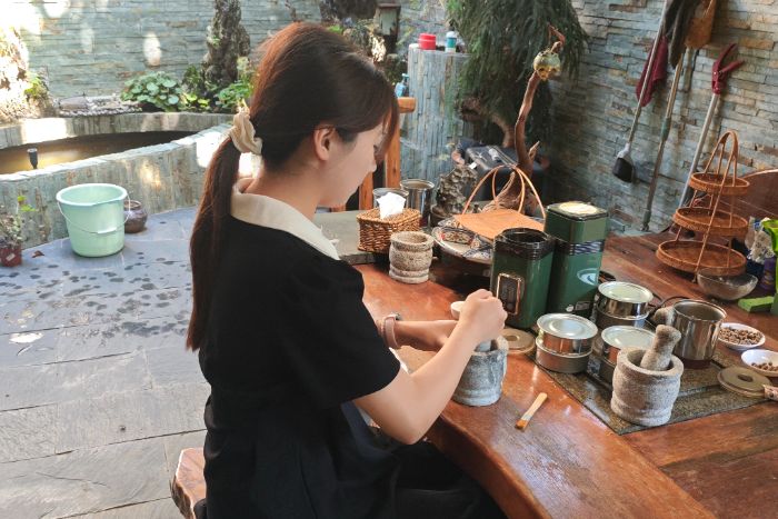 實踐團成員李冰鑫用石臼碾磨香草 陳孜妍攝