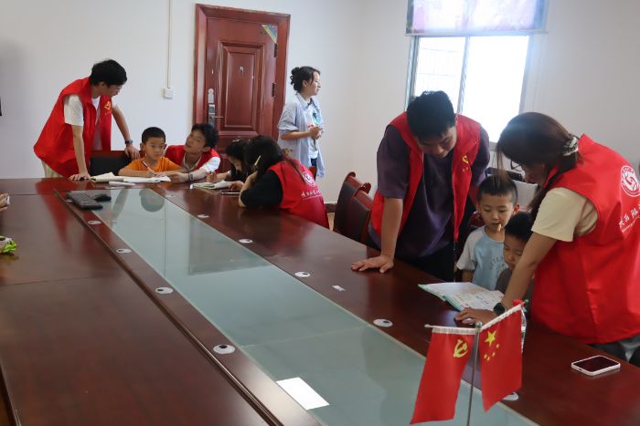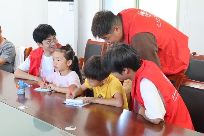 在村委協作下,實踐團隊開展專項志愿服務。在村文化活動中心,開展“七彩課堂”為留守兒童提供學業輔導,耐心講解作業難點,指導學習方法,鼓勵他們刻苦學習,并贈送定制文具禮包。