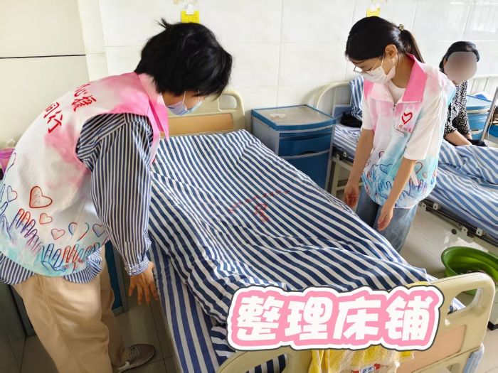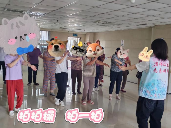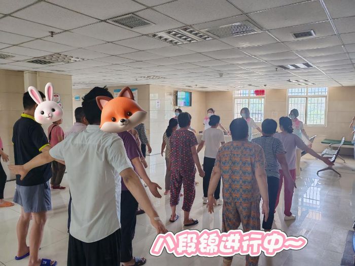強體健心,激活身心能量。清晨的病區走廊里,八段錦的音樂緩緩響起。志愿者帶領患者抬手、屈膝、轉身,每個動作都放慢了節奏,“吸氣時抬手像托著云朵,呼氣時下落要輕如落葉”,有人動作僵硬,志愿者便站在身旁手把手調整姿勢,直到大家都找到舒展的感覺。午后的拍拍操更顯輕快,隨著“一二三四”的口令,拍手、拍肩、拍腿的節奏越來越齊,有人跟不上拍子,周圍便響起善意的笑聲,志愿者笑著說“沒關系,跟著感覺來”。隨后的五步拳練習里,剛勁的動作點燃了活力,拳頭揮出時,仿佛能把積攢的壓力也一并釋放。最熱鬧的是“吹球過橋”游戲,大家手拉手協作前進,有人差點摔倒,立刻被身旁的人扶住,笑聲與歡呼聲充滿了整個房間。看著患者們額頭滲出細汗卻難掩笑意的臉,志愿者真切感受到,運動帶來的不只是身體的活力,更是心靈的放松——當注意力集中在動作與協作上時,病痛的陰霾似乎也淡了許多。