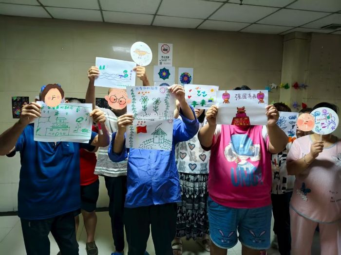 立德潤心,厚植責任擔當。清晨的陽光剛透過病區窗戶,志愿者們輕步走進病房,在與醫護人員查房的過程中,靜靜傾聽患者的傾訴。有人念叨著對家人的牽掛,有人傾訴治療中的焦慮,志愿者們始終以真誠之心靜靜傾聽,以頷首傳遞關切,讓患者的情緒在這份專注里漸漸平復。午后的活動室里,紅色故事分享會如期開始,當“半條被子”里三位女紅軍與村民的溫暖情誼被娓娓道來時,患者們眼中泛起了淚光。隨后,志愿者鋪開畫紙、遞上彩筆,和大家一起繪制愛國手抄報——有人畫下飄揚的紅旗,有人寫下“我愛祖國”的字樣,還有人在扇子上勾勒出五角星的圖案。握著患者遞來的成品,志愿者們忽然明白,“奉獻”從不是空洞的口號,是耐心傾聽時的專注,是傳遞溫暖時的真誠,這份責任擔當,早已在彼此的互動中悄悄融進了心里。在為住院青少年組織的團輔活動里,有了更鮮活的模樣。“桃花朵朵開”的音樂響起時,起初拘謹的孩子們還隔著半步距離,直到有人轉身時不小心撞到一起,慌亂地退開又同時笑出聲,下一秒便自然地拉起了手——這便是德育里的共情與接納,無需多說什么,一個歉意的眼神、一次主動的伸手,就把彼此的距離拉近了。