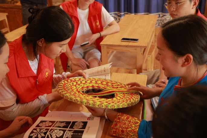 (圖為劉貓妹老師向?qū)嵺`團(tuán)成員介紹花瑤帽)