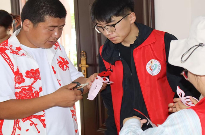 活動伊始,寧縣文化館館長代表全體工作人員對團隊成員的到來表示熱烈歡迎,他談及寧縣作為非遺大縣的文化底蘊,言語間滿是自豪,也懇切希望同學們能通過此行了解寧縣非遺,傳播寧縣非遺。隨后,文化館工作人員向隊員們詳細介紹了當地非遺現狀:慶陽香包、石雕、皮影、剪紙等20余項非遺項目中,已有5項入選省級非遺名錄,但部分技藝面臨傳承人短缺的困境,目前正通過線上推廣等方式拓寬傳承路徑。團隊代表在發言中表示,此行旨在深入學習非遺文化,記錄傳承故事,助力非遺傳播,希望通過實踐加深對非遺文化的理解,為非遺保護貢獻青年力量。座談會后,講解員帶領隊員們參觀展廳。刺繡展柜中,香包色彩艷麗,針腳細密,龍鳳等圖案寓意吉祥;石雕作品線條古樸,將隴東民俗融入石材;皮影人偶薄如蟬翼,鏤空花紋精巧絕倫;剪紙作品則以紅色為主調,展現著節慶的熱鬧景象。在體驗區,隊員們在老師指導下嘗試剪紙。從簡單的窗花輪廓到復雜的紋樣設計,大家專注操作,不時向老師請教技巧,在實踐操作中感受非遺文化的魅力。活動最后,團隊成員與文化館工作人員合影留念。