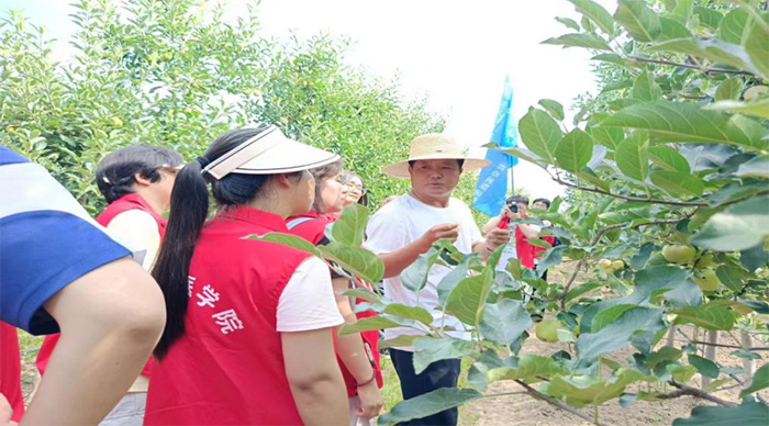 圖為團隊成員在果園中聽工作人員講解蘋果的生長過程的場景。朱帥琦 供圖