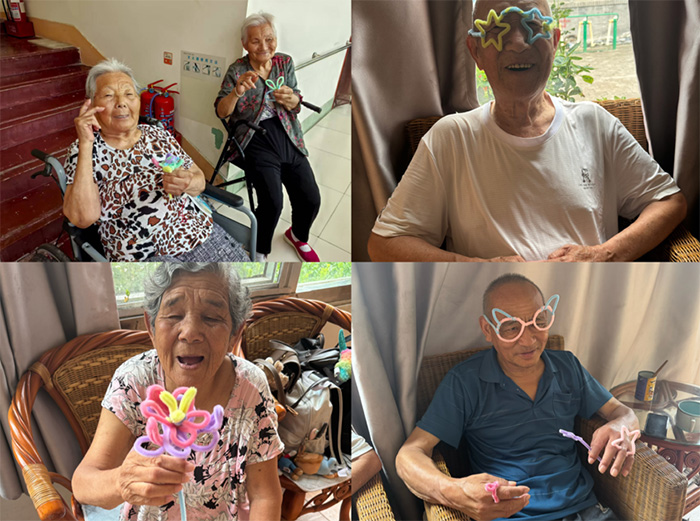 三、巧手筑溫情:扭扭棒里的童心與成就感 在用扭扭棒制作手工的現場是一片創意與溫馨的海洋。小隊成員們耐心地教老人制作簡單的手工藝品,雖然老人們的動作稍顯遲緩,但眼神里卻充滿了專注和孩童般的歡喜。每一件完成的手工作品,都像是被賦予了生命的精靈,承載著老人與實踐團隊共同度過的美好時光。