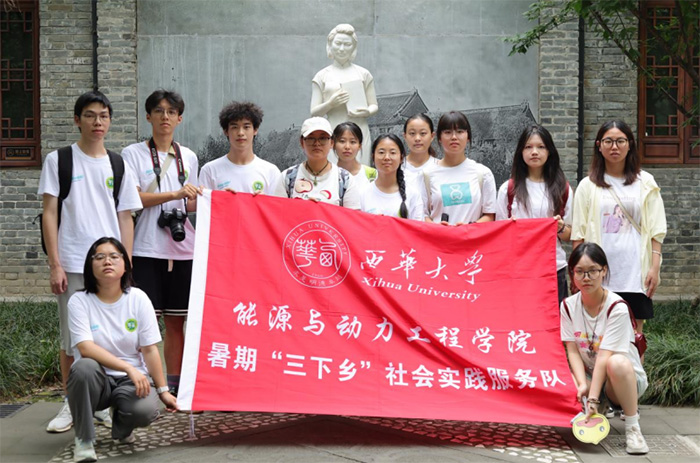 隊員們身著統一白色上衣,在紀念館前的江姐雕像下整齊列隊,舉印有'西華大學能源與動力工程學院暑期三下鄉社會實踐服務隊'字樣的紅色隊旗合影,背景是灰磚墻面和古樸窗欞,展現出青年學子傳承紅色基因的堅定信念。
