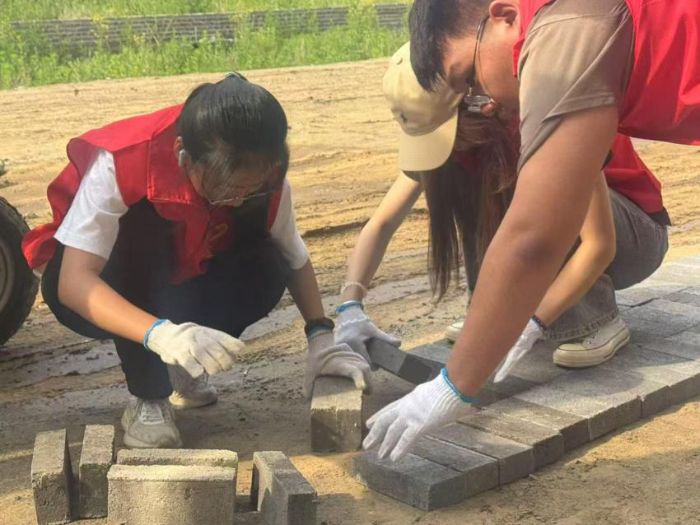 活動現場,盛夏的烈日炙烤著地面,氣溫節節攀升。但志愿者們的熱情比陽光更熾熱,大家迅速分工、默契配合:男生們主動扛起沉甸甸的磚塊,一趟趟往返于材料堆放點和施工區域,額頭上的汗珠順著臉頰滑落,砸在滾燙的地面上瞬間蒸發;女生們則細心整理砂石材料,蹲在地上用小鏟子將縫隙填平,時不時俯身檢查路面平整度,確保每一塊磚塊都鋪得嚴絲合縫。志愿者們分工明確,搬運、整理磚塊,細致鋪裝路面。盡管烈日炎炎,大家仍認真調整磚塊位置,確保路面平整。這些路面改造后,能有效緩解雨天積水、濕滑狀況,方便社區老人出行。