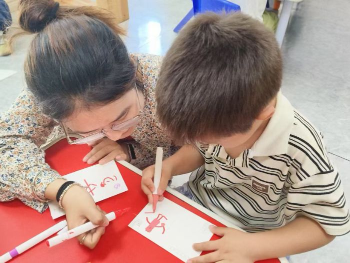 (圖為我志愿者指導(dǎo)小朋友進(jìn)行紅色明信片手工創(chuàng)作,王嘉祺通訊員攝)