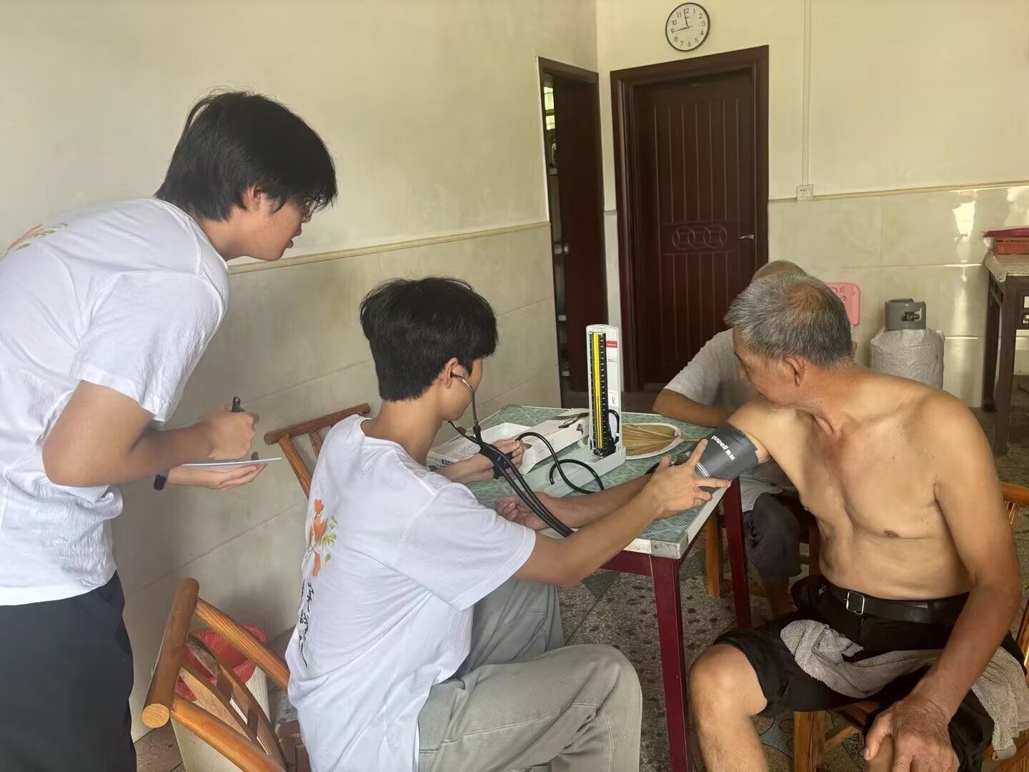 緊隨其后,實(shí)踐隊(duì)入戶隊(duì)員身著統(tǒng)一服裝,帶著血壓計(jì)、聽診器等基礎(chǔ)醫(yī)療器械,以及記錄冊進(jìn)行基本的記錄和調(diào)查。在義診過程中,學(xué)生們耐心細(xì)致地為每一位村民進(jìn)行身體檢查,測量血壓、血糖,并根據(jù)檢查結(jié)果給予專業(yè)的健康建議。對于村民們提出個(gè)人存在的問題,實(shí)踐隊(duì)隊(duì)員們不僅詳細(xì)詢問病情,還為爺爺奶奶們講解疾病的預(yù)防和控制方法。最記憶猶新的是,85歲的曾爺爺在年輕的時(shí)候是人民教師,談吐文雅,增爺爺表示“平常每頓飯喝二兩白酒,胸悶氣短,精神狀態(tài)倍兒好,早睡早起鍛煉身體”于是,實(shí)踐隊(duì)隊(duì)員們叮囑增爺爺要按時(shí)服藥、合理飲食,少喝酒,并定期進(jìn)行體檢。