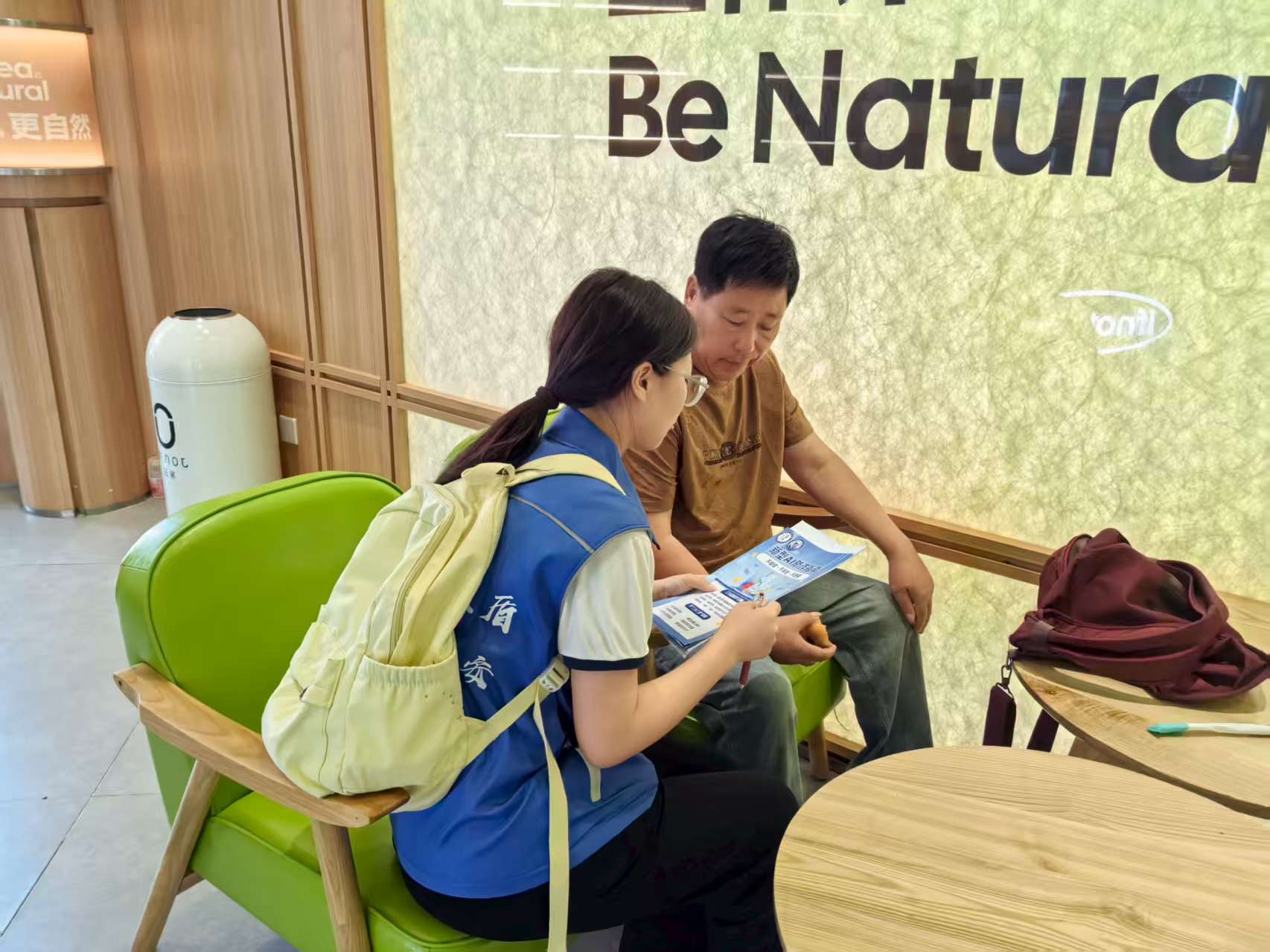 (圖為實踐隊成員在新世界百貨向群眾講解AI詐騙知識 “法盾防詐”實踐隊 闞玲供圖)
