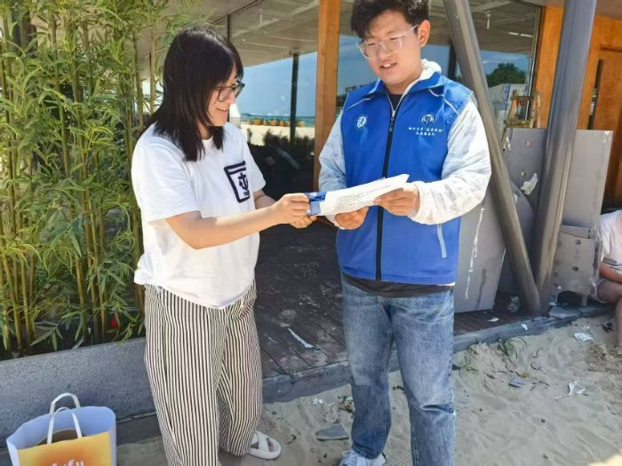 (圖為實(shí)踐隊(duì)隊(duì)員在海邊向游客介紹AI詐騙類型 “法盾防詐”實(shí)踐隊(duì) 王一諾 供圖)