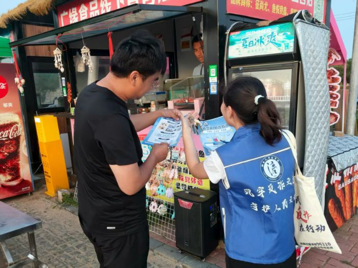 7月16日,實踐隊前往煙臺市牟平區養馬島旅游度假區開展反詐宣傳活動。養馬島被譽為“小馬爾代夫”,風光秀麗,吸引了眾多來自全國各地的游客。為進一步擴大AI詐騙宣傳覆蓋面,實踐隊特意選取人流量較大的美食廣場和網紅打卡點作為宣傳主陣地。實踐隊分為兩組開展活動,一組隊員耐心向游客講解團隊原創設計的AI詐騙宣傳單頁,讓游客了解AI詐騙的常見類型和詐騙手段,提醒游客提高警惕,不輕信陌生信息,注意保護個人信息安全,增強自我防范能力。