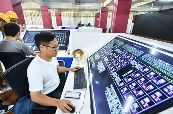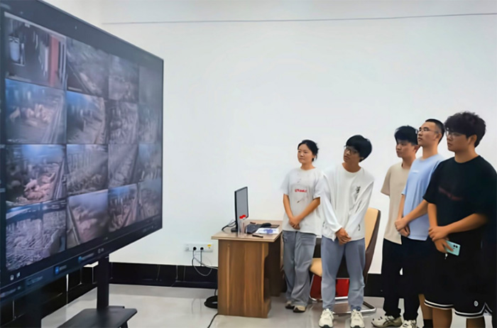 智能中樞:從“人管豬”到“云管豬”的跨越 實踐首日,團隊在湖北中新開維現代牧業有限公司經理方營的帶領下參觀中央控制室。總面積達5000平方米的控制室內,10萬余個控制點的數據實時匯聚于DCS中央控制系統,屏幕上飼料輸送、溫濕度調節、糞污處理等流程動態更新。“傳統豬場1000頭豬需5人管理,這里120萬頭生豬僅需300名技術人員。”方營指向智能飼喂系統介紹。通過預設曲線精準控制投喂量,配合料水比1:2的水拌料工藝,飼料轉化率較傳統模式提升15%。