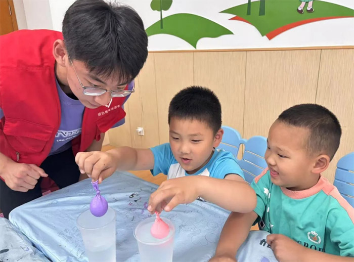 志愿者為孩子們揭開“火山噴發”現象的神秘面紗,此現象是由于泡騰片釋放二氧化碳,密度差讓“巖漿”上浮,氣泡破裂后又回落,模擬真實火山噴發。孩子們在這個過程不僅能感受到科學的樂趣,還可以學到科學知識。
