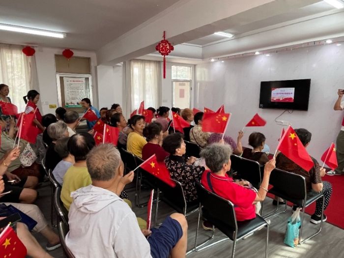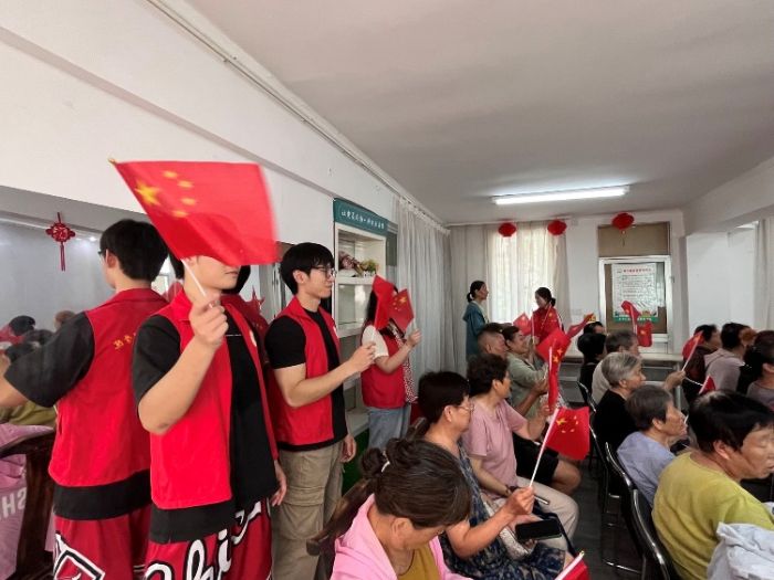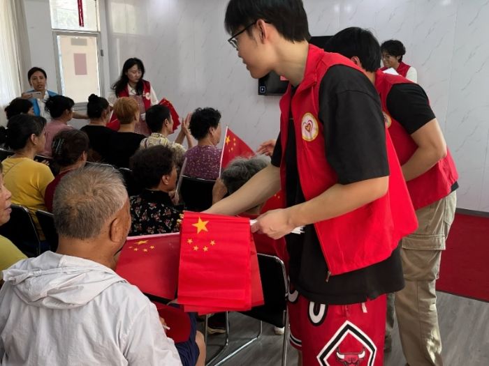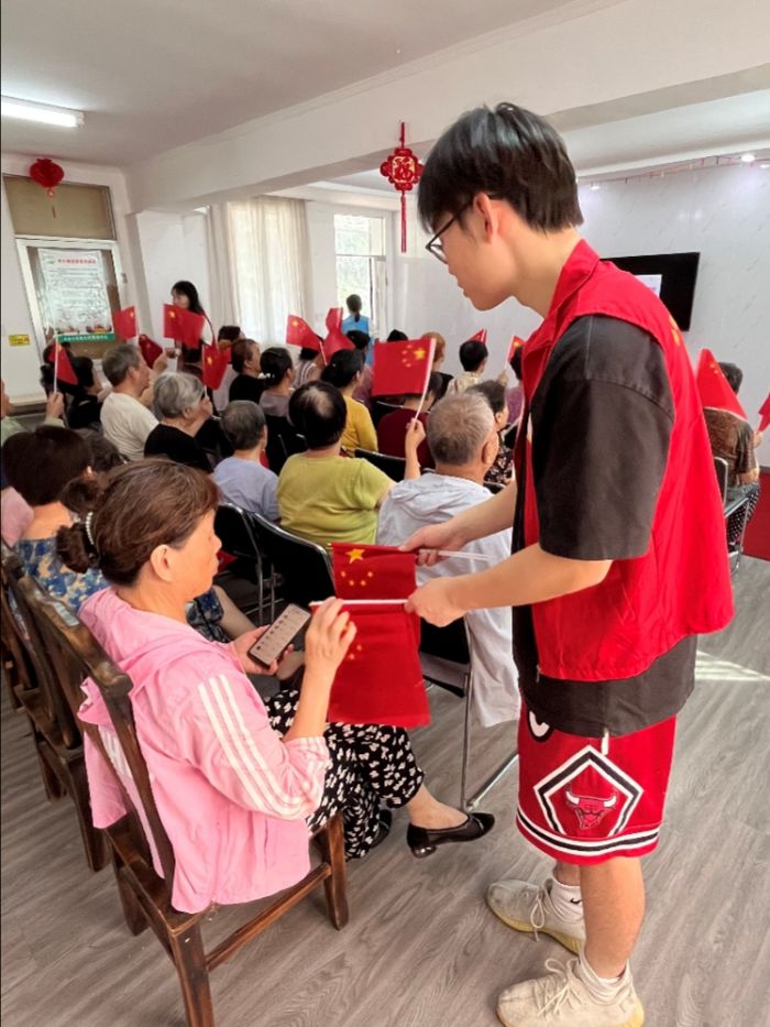 講完后,研究生們走到老人身邊,和大家親切交流。他們拿出準備好的小國旗,一面面鄭重地送到每一位老人手中。接過這鮮艷的國旗,老人們都很激動。一位李爺爺撫摸著國旗,動情地回憶起年輕時看到的部隊,感嘆國家軍隊越來越強大。另一位王奶奶也和大家分享了過去的擁軍故事。隊員們圍坐在老人身邊,認真傾聽他們的故事,分享新時代大學生對國防的理解和對軍人的崇敬。老少兩代人,圍繞著手中的國旗,聊歷史變遷,話國家發展,贊軍隊強大。一面面小小的國旗在老人布滿歲月痕跡的手中輕輕揮動,如同跳動的火焰,凝聚著對人民軍隊的崇高敬意和對偉大祖國的無限熱愛,活動現場彌漫著濃濃的溫情與赤誠。