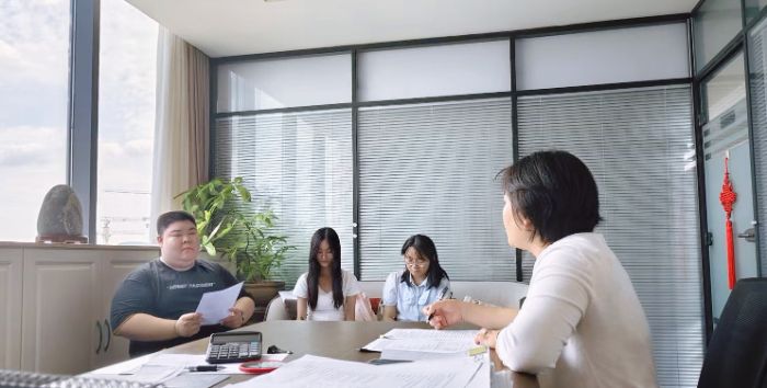 圖為王經(jīng)理、劉經(jīng)理向團(tuán)隊介紹企業(yè)數(shù)智化轉(zhuǎn)型情況 海文馨通訊員攝