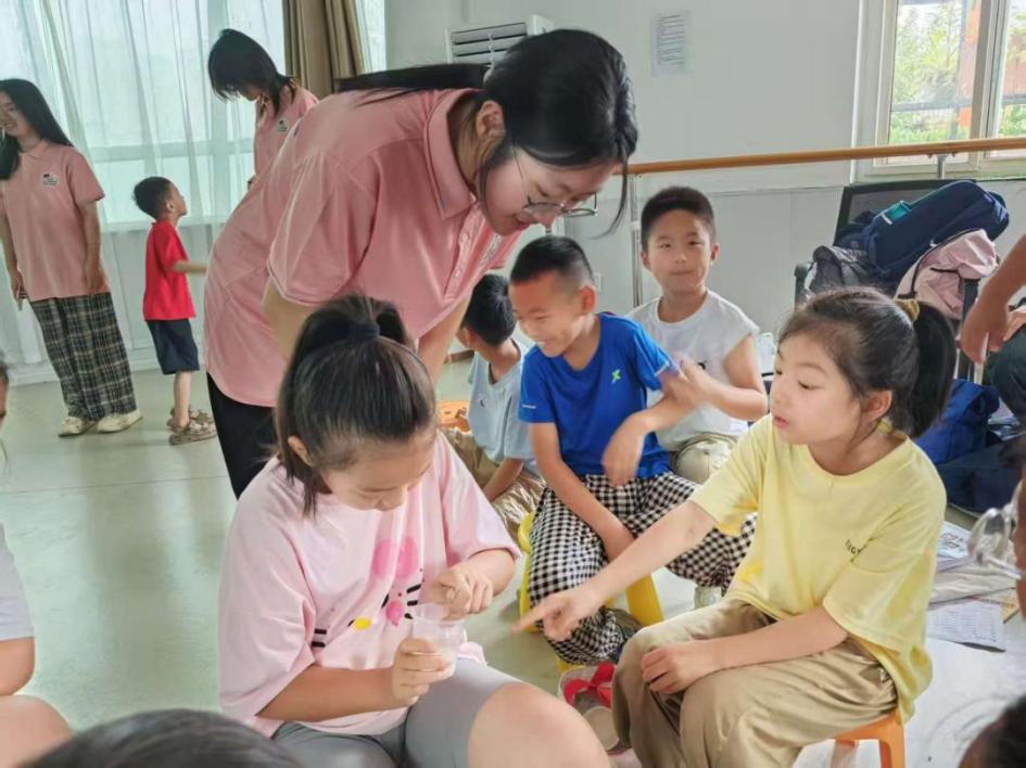 創(chuàng)意工坊:神奇膠黏劑“DIY”環(huán)節(jié) 在手工制作環(huán)節(jié),孩子們分成小組,在大學生志愿者的指導下開始制作起泡膠。按照配方依次加入膠水、洗發(fā)水、清水和硼砂水,不斷攪拌揉捏,原本稀散的液體逐漸變成了富有彈性的膠體。“要慢慢攪拌,讓每種材料充分融合,就像好朋友手拉手一樣。”大學生志愿者在各組間巡回指導。當看到自己親手制作的起泡膠能拉伸、能起泡,還能粘起小紙屑時,孩子們臉上洋溢著成就感。