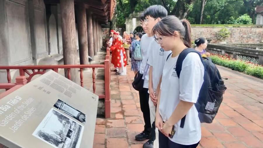 實踐隊走進河內國子監文廟,這座始建于 11 世紀的文化地標,留存著中越文化交融的千年印記。隊員們在古色古香的院落中駐足,觀賞碑刻上的漢字典籍,聆聽當地學者講述越南科舉制度與中國文化的淵源。從建筑風格到禮儀習俗,從文字傳承到思想影響,處處可見中華文明與越南文化的互鑒共生。