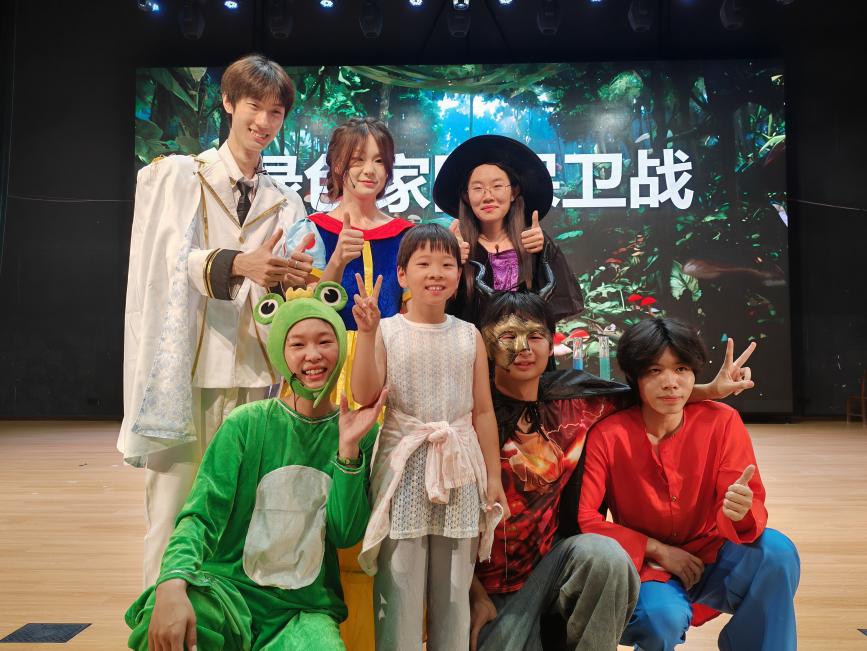 青春演繹傳遞環(huán)保初心,沉浸式互動(dòng)點(diǎn)燃科普熱情 實(shí)踐團(tuán)的同學(xué)們用飽滿的熱情和生動(dòng)的表演,成功塑造了勇敢的小青蛙、善良的白雪公主、威嚴(yán)的森林守護(hù)神、智慧的女巫以及滑稽又具警示意義的污染惡魔等角色。詼諧的臺(tái)詞、緊張的情節(jié)、充滿希望的結(jié)局,深深吸引了在場(chǎng)的小觀眾。演出過(guò)程中,小朋友們時(shí)而為角色的遭遇緊張擔(dān)憂,時(shí)而被逗得開(kāi)懷大笑,時(shí)而又為正義的勝利熱烈鼓掌。劇中傳達(dá)的珍愛(ài)環(huán)境、保護(hù)生態(tài)、勇于擔(dān)當(dāng)、運(yùn)用科學(xué)知識(shí)解決問(wèn)題的核心思想,也在寓教于樂(lè)中浸潤(rùn)童心。