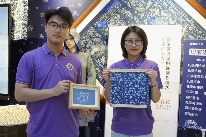 (圖為成員劉恒瑞(左)和周欣宜(右)展示親手制作的藍印花作品。付藝恒攝)