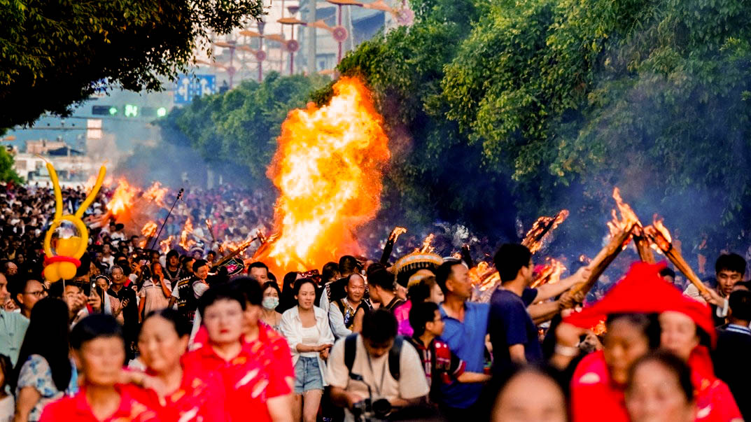 圖為7月18日,實踐團隊跟隨群眾進行景東彝族火把游行儀式。沈夢秋攝