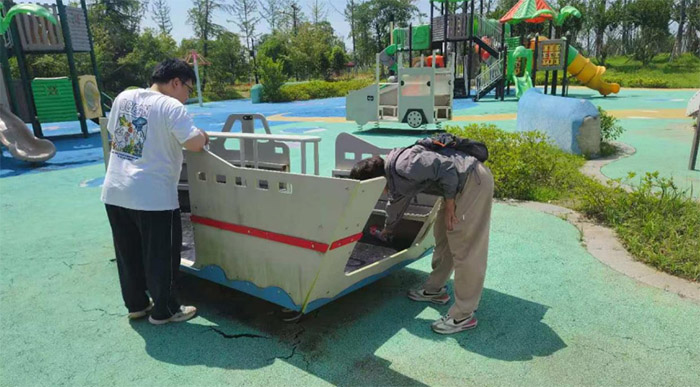 第二組聚焦公園步道與休息區,他們帶著掃帚、簸箕與消毒噴霧,不僅清掃路面的落葉與碎石,還對涼亭長椅、健身器材進行擦拭消毒。在兒童游樂區,隊員們發現老化的地面墊邊緣翹起,便先徒手清理墊下堆積的泥沙與零食碎屑,再用粉筆在旁邊標注“此處需維修”的提示,方便后續公園管理方處理。第三組則深入草坪與植被區,趴在草地上撿拾隱藏的塑料碎片、煙頭,連樹根纏繞的廢棄漁網都耐心拆解清理。三個小時的清掃中,隊員們共清理出23袋垃圾,其中可回收物8袋、廚余垃圾3袋、其他垃圾12袋,每袋都按分類標準仔細分裝。