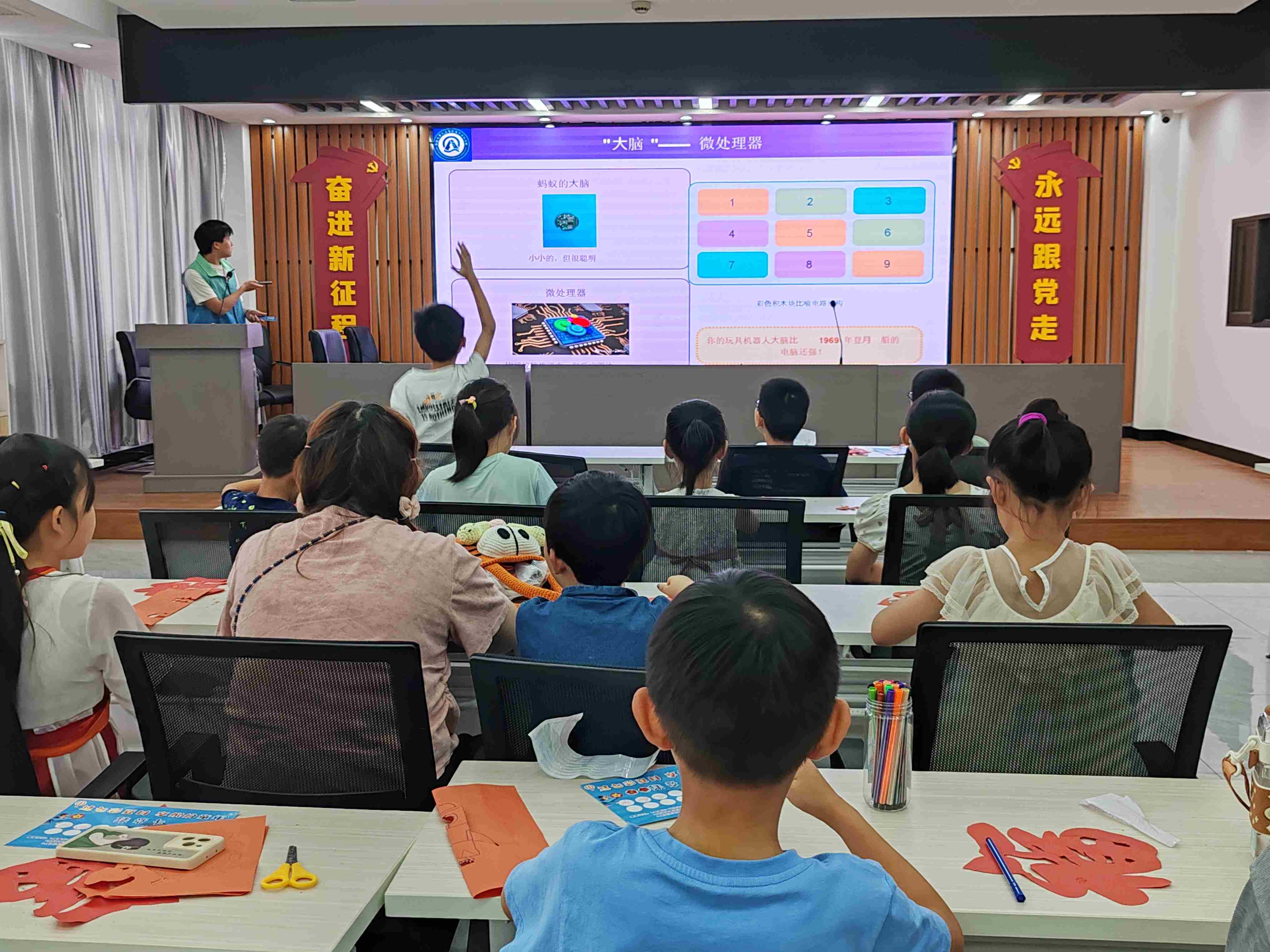 在科技科普環節,志愿者以“趣談嵌入式”為主題,通過智能手表、無人機等日常生活中的例子,向孩子們介紹了嵌入式系統的基本原理和應用。他用通俗易懂的語言解釋了嵌入式系統的三大功能——信息采集、內部處理和執行操作,通過展示不同類型的嵌入式設備,比如自動巡航玩具車、語音交互模塊以及智能家居產品(如掃地機器人),讓學生們直觀地理解了這些技術如何影響著我們的日常生活。