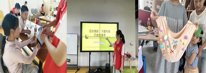 為打破科普的抽象感,布衣“碳”險家團隊匠心獨運,精心打造了沉浸式互動環節。舊衣物改造活動宛如一場夢幻的魔法盛宴,悄然拉開了帷幕。孩子們如同懷揣著神奇咒語的小魔法師,圍坐在擺滿舊衣物的工作臺旁,眼中閃爍著興奮與好奇的光芒。那些曾經被遺棄在角落、黯淡無光的舊衣物,在孩子們靈動的指尖下,仿佛被賦予了新的生命。他們輕輕撫摸著衣物的紋理,用心感受著每一寸布料的故事,隨后拿起剪刀,小心翼翼地裁剪,如同在雕琢一件珍貴的藝術品;穿針引線時,那專注的神情,仿佛在編織著一個關于環保的美麗夢想。在這個過程中,抽象的環保知識不再是枯燥的文字和理論,而是化作了孩子們手中實實在在的行動。他們親眼見證了舊衣物如何通過巧妙的改造,變廢為寶,成為生活中實用又獨特的物品。這種身臨其境的體驗,讓環保的理念如潺潺溪孩子們的心田,使他們深刻領悟到資源循環利用的無窮魅力。