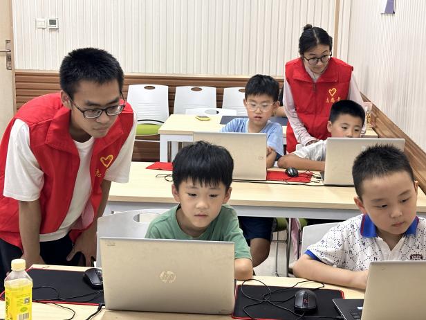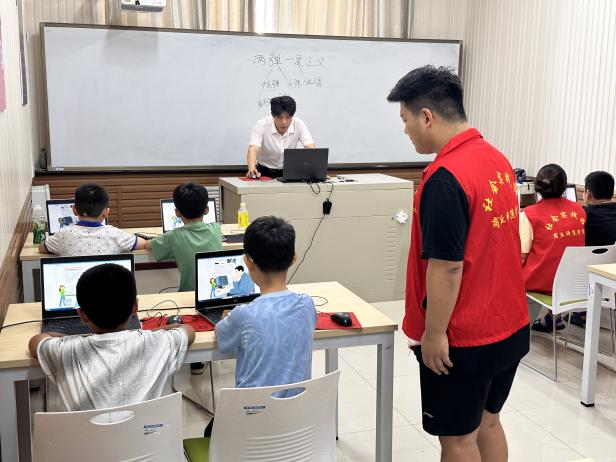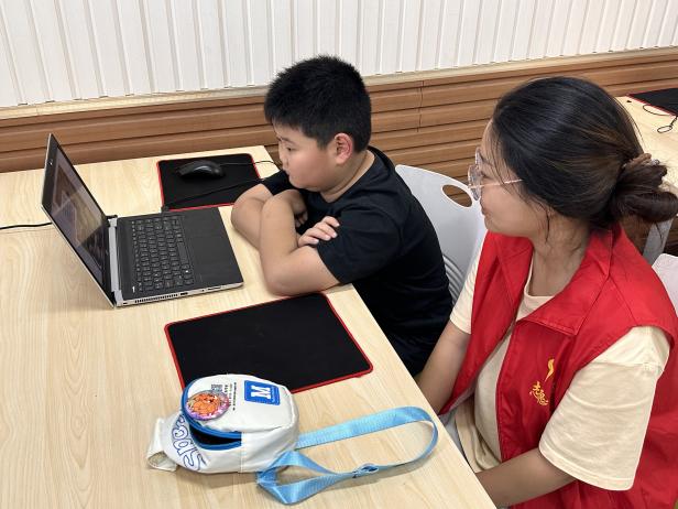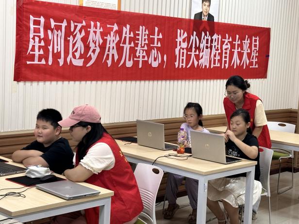 在專業(yè)教師布置“兩彈一星”主題編程任務(wù)后,宣講團(tuán)志愿者迅速對(duì)接小學(xué)生開展精準(zhǔn)輔導(dǎo)。志愿者們一對(duì)一坐在學(xué)生身旁,耐心指導(dǎo)他們運(yùn)用編程邏輯模擬衛(wèi)星運(yùn)行軌跡、構(gòu)建火箭發(fā)射程序或設(shè)計(jì)科學(xué)家攻關(guān)場(chǎng)景。輔導(dǎo)過(guò)程中,志愿者同步延伸講解“兩彈一星”元?jiǎng)椎年P(guān)鍵貢獻(xiàn),引導(dǎo)少年兒童在代碼世界中具象化理解“自力更生”“大力協(xié)同”等精神內(nèi)涵。