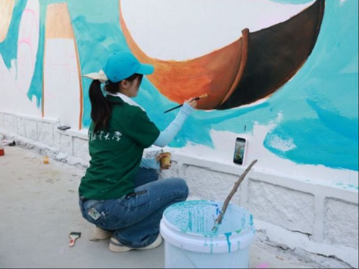 創作中,隊員們分工協作:有人蹲在墻根用粉筆勾勒初稿,有人站在腳手架上調制礦顏料,有人頂著烈日細致填色,路過的村民也時不時駐足欣賞。經過數日努力,原本單調的墻面煥然一新,成為展示四女寺鎮文化底蘊的亮麗風景線。最終,原本單調的墻面蛻變為講述古鎮故事的“文化長廊”,既扮靚了鄉村街巷,更讓沉睡的歷史有了可視可感的新載體。這次墻繪活動不僅美化了鄉村環境,更讓隊員們在實踐中加深了對運河文化的理解。