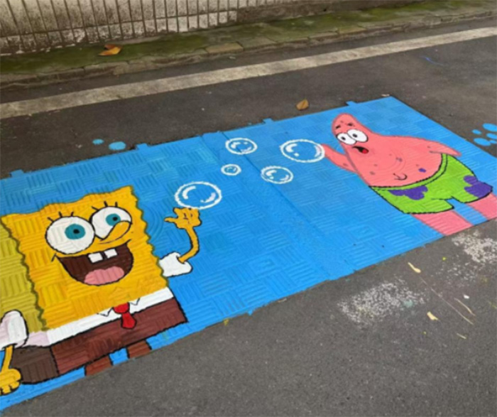 斑駁墻面上,志愿者們用顏料勾勒出“孝親敬老”的傳統故事與“垃圾分類”的現代倡議,古今元素的碰撞讓百米墻面成為傳播文明的長廊;井蓋之上,原本灰暗的水泥面被繪成憨態可掬的熊貓、靈動跳躍的錦鯉,以及海綿寶寶、米老鼠等眾所周知的卡通角色,低頭可見的趣味讓居民出行多了份驚喜;銹跡斑斑的電變箱則穿上“文化外衣”,包公故里的歷史典故與社區志愿服務的暖心場景在此交融,生硬的設施變成了承載社區記憶的文化符號。