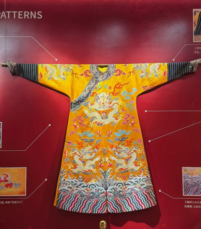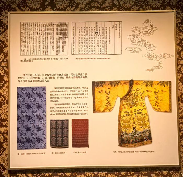 步入"云錦天衣"展區,首先映入眼簾的是一座精美的大型傳統織機模型。展區通過詳實的圖文說明和實物展示,詳細介紹了庫緞、織金、庫錦與妝花等不同云錦品種的特點和制作工藝。“江寧織造在明清時期是皇家絲綢的主要供應地,其生產的云錦不僅要滿足宮廷需求,還要作為外交禮品。”講解員介紹道。館內陳列的藍地龍蓮妝花緞、龍袍、馬褂等,讓我們近距離領略了云錦的華美與精致。每一件展品都承載著歷史的記憶,見證了江寧織造曾經的繁華與榮耀。