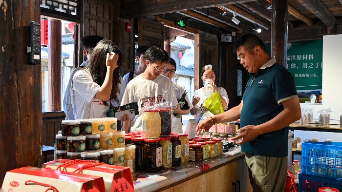 隨后,犁橋景區(qū)工作人員帶著我們參觀了犁橋景區(qū)中的銅藝作坊,中華白姜館等具有銅陵特色產(chǎn)品作坊。不僅體驗(yàn)了銅陵特色美食,還欣賞了許多非物質(zhì)文化遺產(chǎn)。隨后,我們有幸采訪了景區(qū)招商主管周旭,對犁橋景區(qū)近年來取得的快速發(fā)展和未來的發(fā)展規(guī)劃進(jìn)行了討論。犁橋景區(qū)在2021年被評為國家4A級風(fēng)景區(qū)。談到犁橋景區(qū)將如何在眾多古鎮(zhèn)風(fēng)景區(qū)中具有競爭力,周主管表示還是要發(fā)揮犁橋水鎮(zhèn)“水”元素的重要性。景區(qū)一直致力于發(fā)展各種水上項(xiàng)目如非遺表演,竹竿戲等等。另外周主管還提到大力發(fā)揚(yáng)犁橋地區(qū)石雕與木雕文化的重要性。同時(shí)也提到了實(shí)際面臨的一些挑戰(zhàn),比如如何以通俗易懂的方式讓更多人了解石雕木雕文化,尤其是青少年群體。我們也提出了一些建議,比如發(fā)展一些實(shí)踐活動,讓更多人在手工實(shí)踐的過程中更好的了解這些文化。關(guān)于招商引資的問題,周主管表示希望犁橋地區(qū)的店鋪能夠具有特色,避免流水線模式,同時(shí)管理部門也在對部分店鋪進(jìn)行改善和更換。