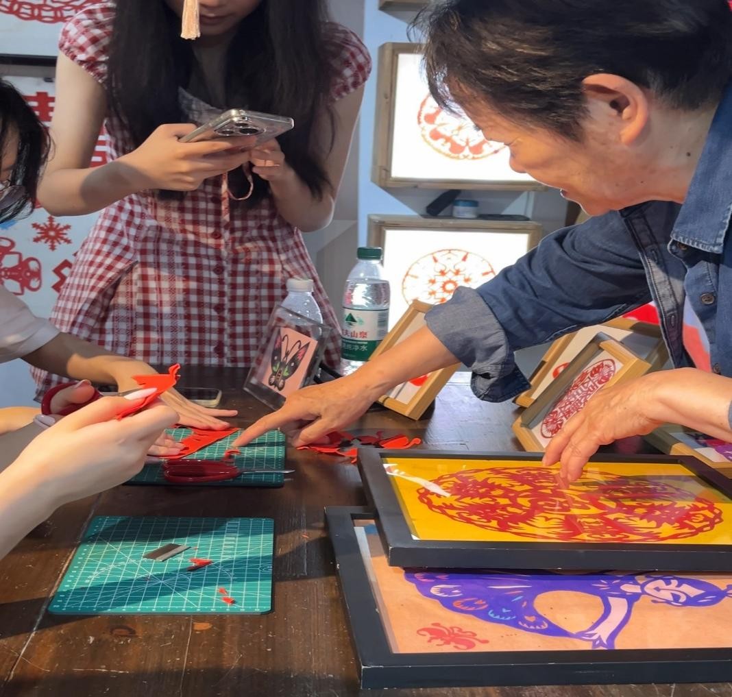 圖為任老師指導來實踐的英語專業(yè)學生進行剪紙。王瀚曼供圖