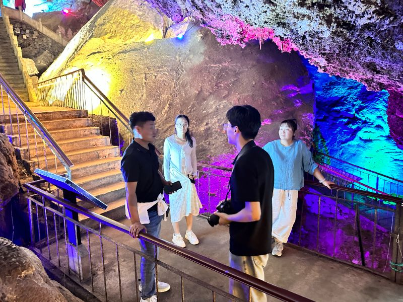 實(shí)踐團(tuán)隊(duì)深入雞冠洞景區(qū),對(duì)照生態(tài)保護(hù)技術(shù)與運(yùn)營(yíng)細(xì)節(jié)開(kāi)展沉浸式觀察。在景區(qū)內(nèi)部,團(tuán)隊(duì)重點(diǎn)關(guān)注了照明系統(tǒng)、防護(hù)間距、游客疏導(dǎo)等設(shè)施布設(shè)情況。調(diào)研發(fā)現(xiàn),雞冠洞普遍采用冷光源燈具,所有照明設(shè)備均與鐘乳石保持安全距離,避免熱輻射造成物理破壞;洞內(nèi)通道設(shè)置合理、指引清晰,并通過(guò)設(shè)置限流通道與實(shí)時(shí)監(jiān)測(cè)系統(tǒng),有效管控游客數(shù)量,維護(hù)景區(qū)生態(tài)承載力。