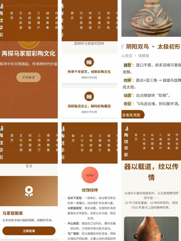 數字化傳承:創建“陶紋華彩”網站 為了進一步擴大馬家窯文化的影響力,實踐隊員還搭建了一個名為“陶紋華彩”的網站。該網站不僅作為此次實踐活動的成果展示平臺,更是一個集文化、教育和互動為一體的數字空間。網站設有“文化探源”、“紋樣圖鑒”、“三維展廳”、“媒體聚焦”和“傳承創新”等多個板塊。訪問者可以深入了解馬家窯文化的起源與發展,欣賞詳細的紋飾圖樣,甚至通過三維技術“親臨”虛擬展廳,沉浸式體驗馬家窯彩陶的藝術魅力。