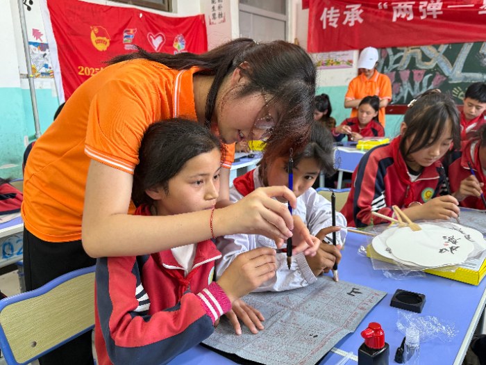 文化互動:以筆墨傳承紅色情懷 文化互動環節中,志愿者們還將“兩彈一星”精神融入傳統技藝教學。書法桌前,宣講團成員帶領小朋友們書寫“愛國奉獻”“艱苦奮斗”等詞,從執筆姿勢到筆畫力道進行了細致講解;另一側,孩子們拿起畫筆在扇面上勾勒紅柳、火箭圖案,繪畫著科學家們扎根戈壁的故事。筆墨流轉間,紅色基因與文化傳承相互交融,讓精神力量在書畫創作中悄然傳遞。