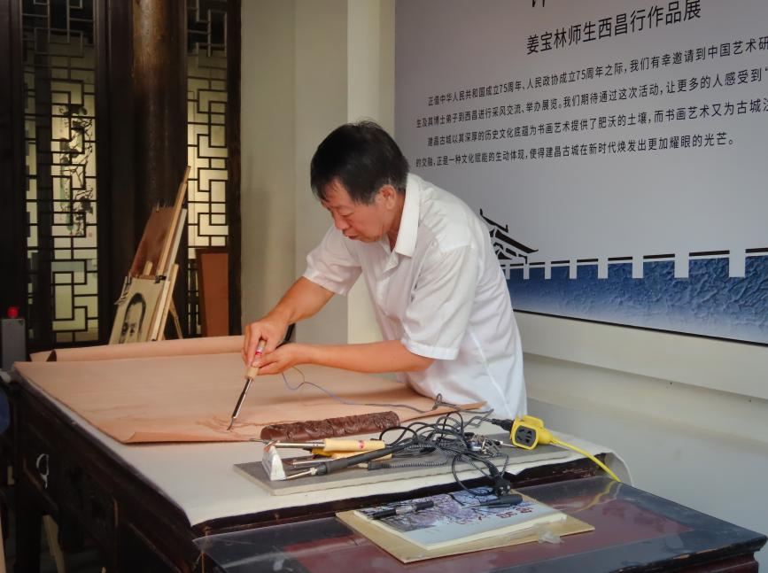 7月8日下午,實踐隊又于建昌古城拜訪了彝族火繪(烙畫)技藝傳承人洪昌恒老師。在洪老師的工作室,他為我們現場展示了火繪技藝的核心技法,講解了如何通過控制烙鐵的溫度、力度和速度來表現豐富的線條與明暗層次。