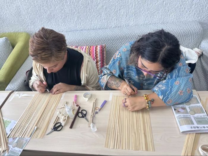 在實踐隊員的悉心指導下,來自各國學員們紛紛開始學習基本的竹編技巧。從精心挑選竹條、穩(wěn)固骨架到細膩編織扇面,每個步驟都充滿挑戰(zhàn)與樂趣。一位日本學員在嘗試過程中感慨:“這些細竹條在老師手里十分聽話,到我手里卻很難操控,真需要耐心和技巧!”經(jīng)過反復嘗試與摸索,學員們逐漸掌握編織要領,一把把竹扇雛形在他們的努力下悄然顯現(xiàn)。竹條在學員指尖翻飛,不僅體現(xiàn)著古老技藝的傳承與創(chuàng)新,更預示著兵家智慧與竹編藝術融合的美好前景。