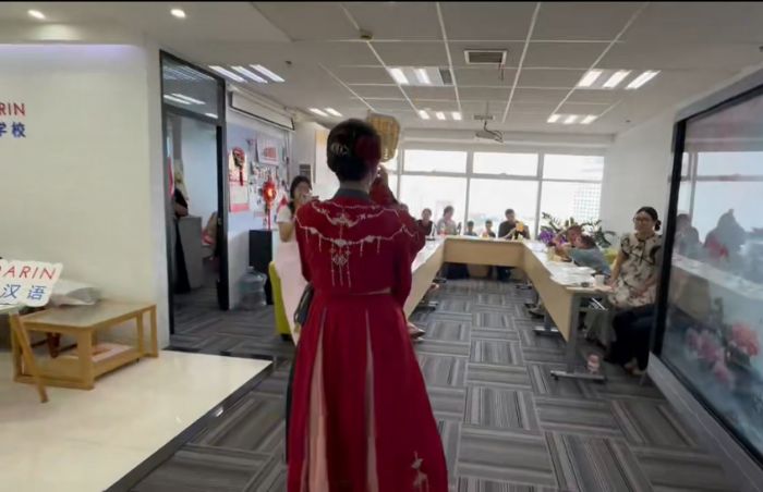活動最后,為進一步展現(xiàn)中華文化的韻味與風采,實踐隊隊員身著漢服,手拿竹編扇,為外國學員們表演了一支古典舞。隊員身姿輕盈,舞步規(guī)范,手中的竹編扇隨舞姿有節(jié)奏地搖曳,將兵家文化的智慧與竹編技藝的精妙融合呈現(xiàn),構成一幅生動的文化畫面。這不僅是對竹編文化和兵家文化的生動展示與傳承,也是對中華文化創(chuàng)新與發(fā)展的有力詮釋。