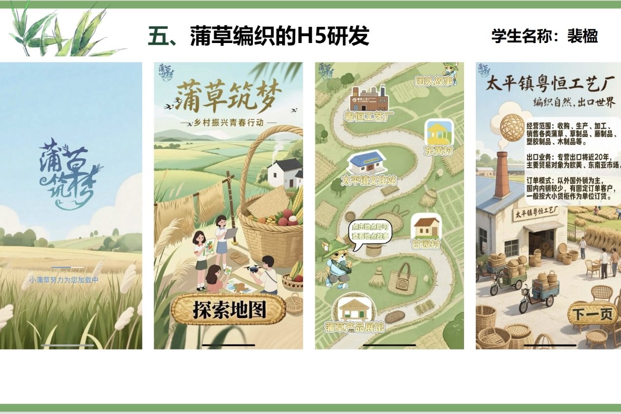 在通過前期的考察和指導老師的建議,蒲草筑夢設計組在歷經了14天的實踐活動成功完成了包括“蒲草產品設計”、“蒲草海報宣傳設計”、“蒲草H5交互設計”“蒲草動畫設計”、“蒲草服裝飾品設計”等關鍵項目,其中共設計了70種產品,13張海報,58種服裝飾品,20張H5頁面以及一份交互設計,2個動畫代言人物以及30秒的宣傳動畫。