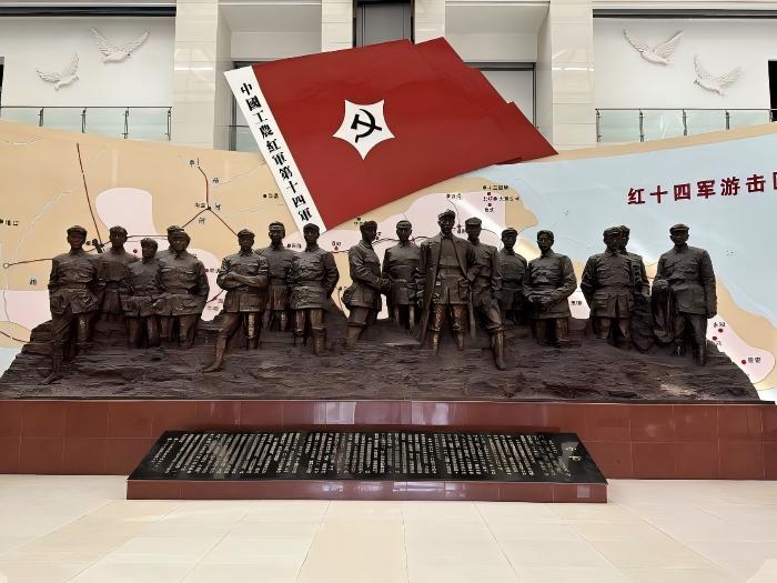 序廳中,一尊高5米、寬8米的紅十四軍戰士群雕展現出宏偉氣勢,士兵們手握武器、目光堅毅,生動再現革命勇士沖鋒陷陣的勇敢姿態。雕塑兩側的展墻上,張愛萍、李維漢、劉瑞龍、黃火青等老一輩無產階級革命家的題詞,力量感十足,“英雄業績彰日月,革命精神激后人”,字里行間表達了對紅十四軍英烈的深切緬懷和崇高敬意,讓人們深刻感受到歷史的沉重和先輩們革命的情懷。