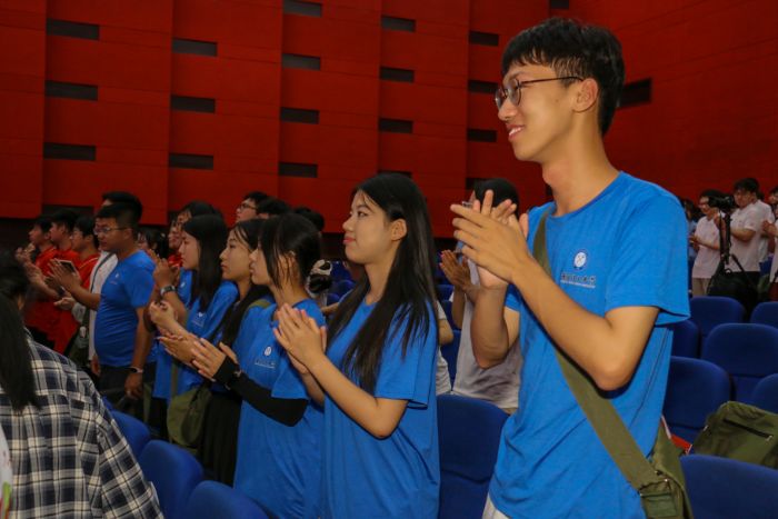 學(xué)習(xí)了井岡山精神的深刻內(nèi)涵之后,同學(xué)們(著藍(lán)色隊(duì)服)起立鼓掌。王智杰 攝