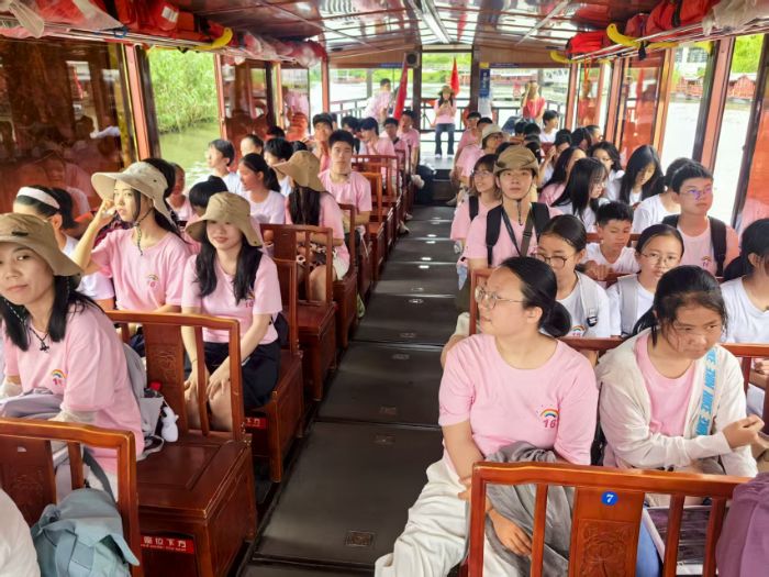 登岸后,步行途中的油菜花田與鳶尾花海交織成畫,孩子們或數花瓣、或合影,興致高昂,盡顯人與自然和諧之美。