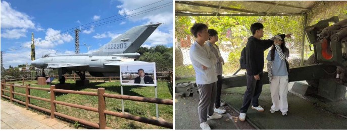 移步至園區軍事設施、掩體和炮戰遺址參觀學習點。一架戰機率先映入眼簾,沉默卻有力地拉開歷史帷幕。接著隊員們近距離觀察舊時裝備、探尋戰斗痕跡,了解坦克、火炮等。
