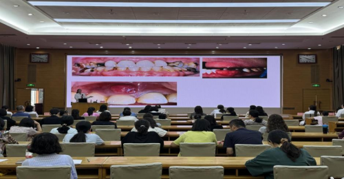 “每天刷牙三分鐘,要做到‘面面俱到’,尤其要清潔牙齦溝等易忽視區域。”鄭州大學口腔醫(學)院預防疾病科秦紅霞主任結合豐富的臨床經驗,用職工們熟悉的"黃河護堤"作比:"就像守護堤壩要防微杜漸,口腔健康也得從小問題抓起,早期齲齒、輕度牙周炎及時干預,就能避免'潰堤'風險。"講座中,秦醫生用通俗比喻解讀專業知識,還現場演示巴氏刷牙法。她將刷毛與牙齒呈45度角,輕柔指向齦溝,以小幅度水平震顫的方式,每次刷2-3顆牙,沿牙面朝向冠方拂刷。她依次清潔上下頜牙齒的外側、內側及咀嚼面,特別強調牙齦交界區、后牙遠中等易遺漏部位也要精準清潔,全程動作輕柔而系統,避免粗暴橫刷。秦主任將優質口腔健康知識科普送至基層一線,以鮮活的情景演示加深職工理解,筑牢職工健康基礎。
