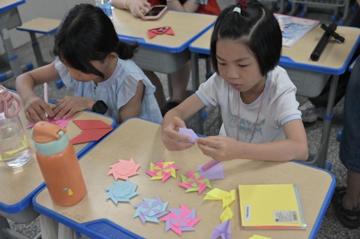 圖為孩子們在折紙課上認真折紙,極大的拓展了孩子們的動手能力。多彩大學生網通訊員黃夢婷攝