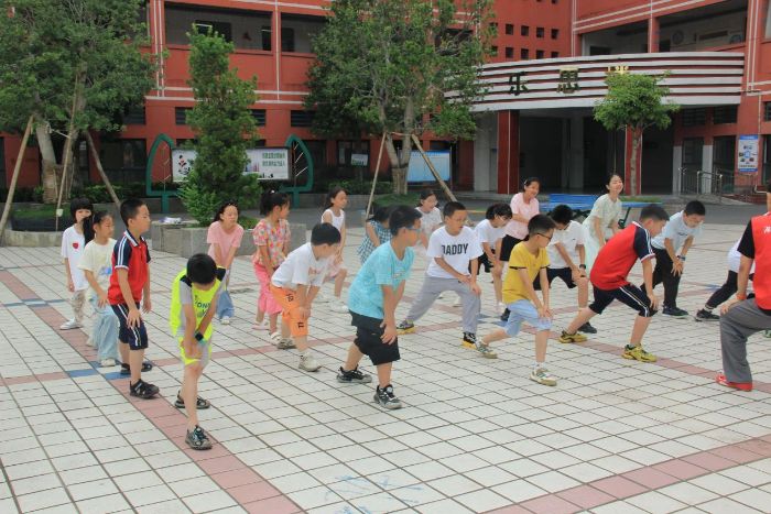 圖為志愿者在體育課上帶領孩子們熱身,為體育運動做準備。多彩大學生網通訊員黃夢婷攝
