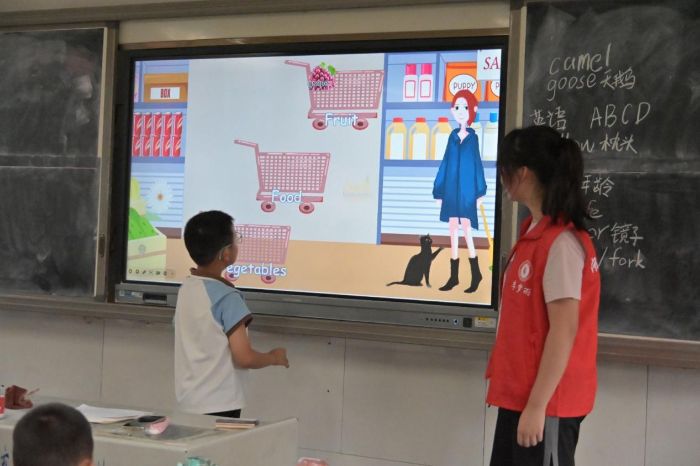 圖為志愿者在英語課上用趣味游戲讓孩子們了解到了日常食品,并加深了孩子們的印象。多彩大學生網通訊員黃夢婷攝