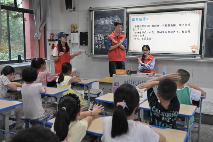 圖為志愿者在性教育課上給大家帶來的情景演繹,告訴大家遇到性侵害應大膽拒絕,守護孩子們的健康成長。多彩大學生網通訊員黃夢婷攝