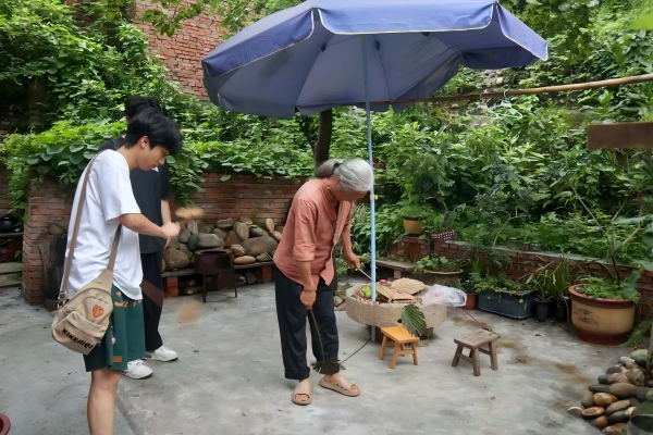 實踐首日,團隊赴鑫田糧藝試驗田與綿州匯館進行實地考察。盛夏的試驗田綠意盎然,卻也蚊蟲滋生。傳承人潘德貴老師貼心為大家準備了傳統驅蚊工具“撣撣”,并笑著說道:“這‘撣撣’可是我們老農人的‘寶貝’,別看它簡單,一草一葉都是自然的饋贈。”在潘老師的帶領下,隊員們深入田間,認真觀察作物生長狀況,了解傳統農業技藝的現代應用。親手使用“撣撣”的體驗,不僅讓大家感受到傳統農具的實用智慧,更體會到農耕文明中人與自然和諧共生的生態理念。